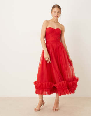 Lace & Beads corset overlay ruffle hem midaxi dress in red