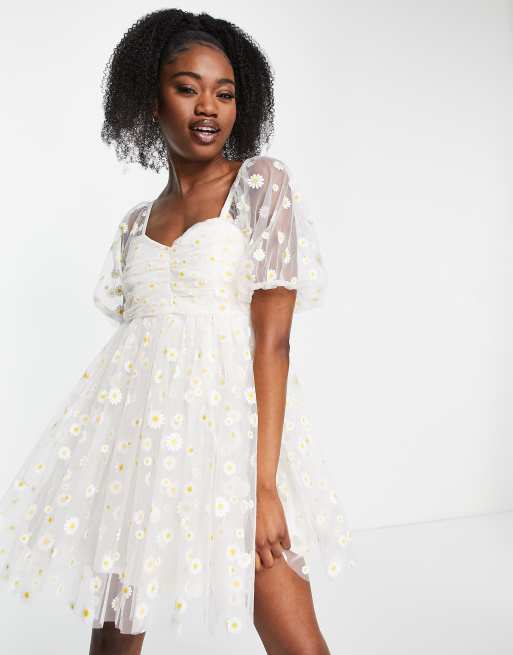 Lace & Beads embroidered mini dress with sheer sleeves in white daisy