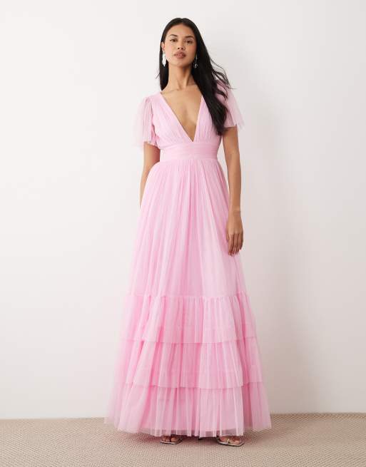 Lace & Beads Madison tulle flutter sleeve v neck maxi dress in pink