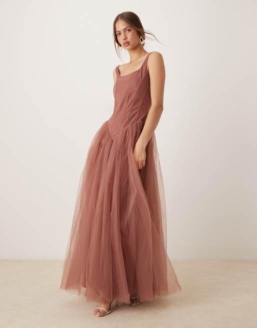 Lace & Beads ruffle hem corset maxi dress in rose brown