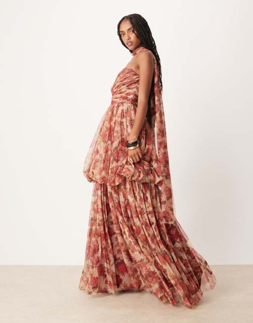 Lace & Beads tiered tulle maxi gown with scarf in red rose
