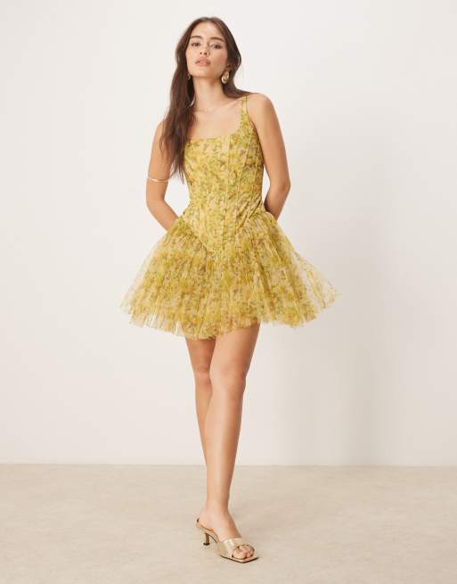 Lace & Beads tulle drop waist corset mini dress in yellow buttercup floral