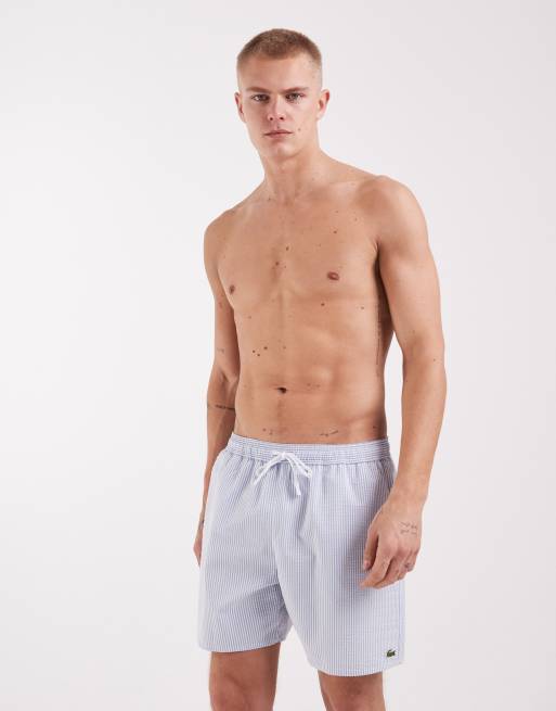 Lacoste classic logo stripe swim shorts in ligth blue