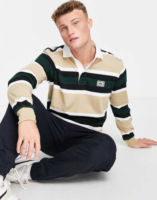 Lacoste striped long sleeve polo shirt in beige
