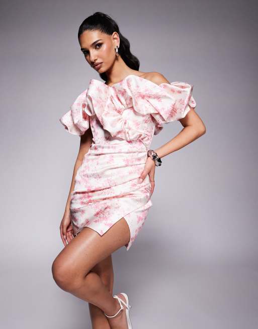 Lavish Alice bonded satin bardot mini dress in fuschia pink porcelain print