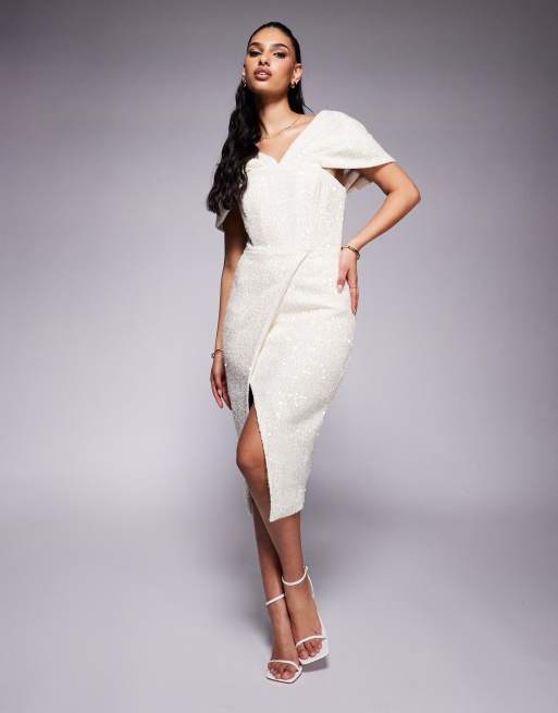 Lavish Alice draped bardot sequin boucle midi dress in beige