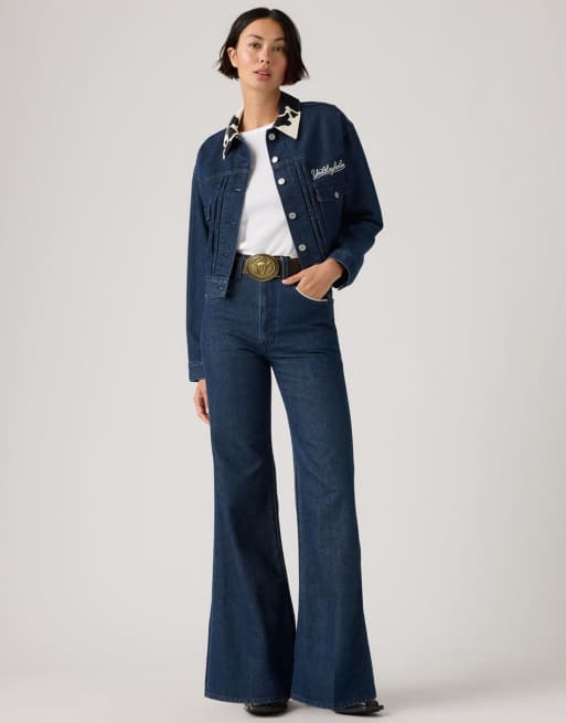 Levi's Toy Story ribcage flare bell jeans with cow print waistband in indigo co-ord