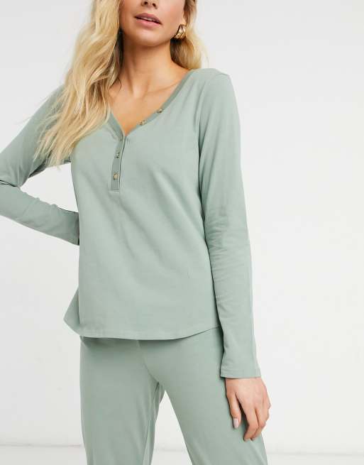 Lindex Astrid cotton button front pyjama top in dusty green - MGREEN