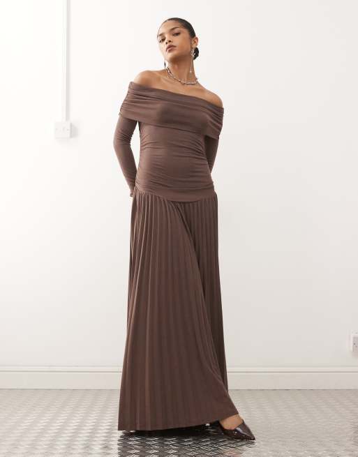 Lioness Field of Dreams glitter long sleeve foldover bardot ruched drop waist pleated maxi dress in chocolate