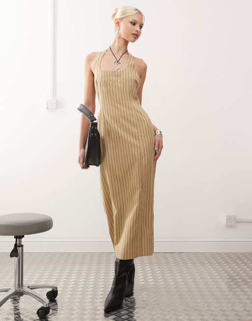 Lioness halter neck back split midi dress in beige stripe