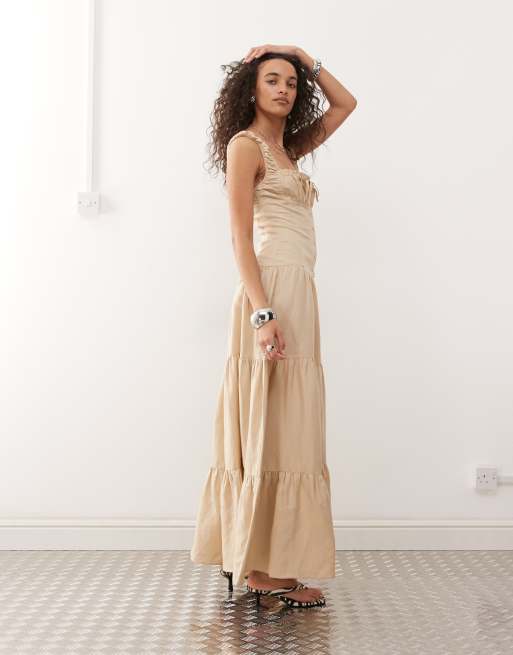 Lioness Heart Shaped linen blend milkmaid button detail tiered maxi dress in beige