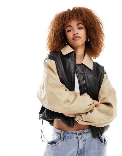 Lioness leather look contrast bomber jacket in black and camel