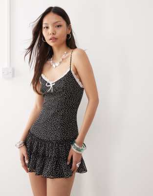 Lioness Yves strappy contrast lace trim polka dot ruffle skirt mini dress in mono