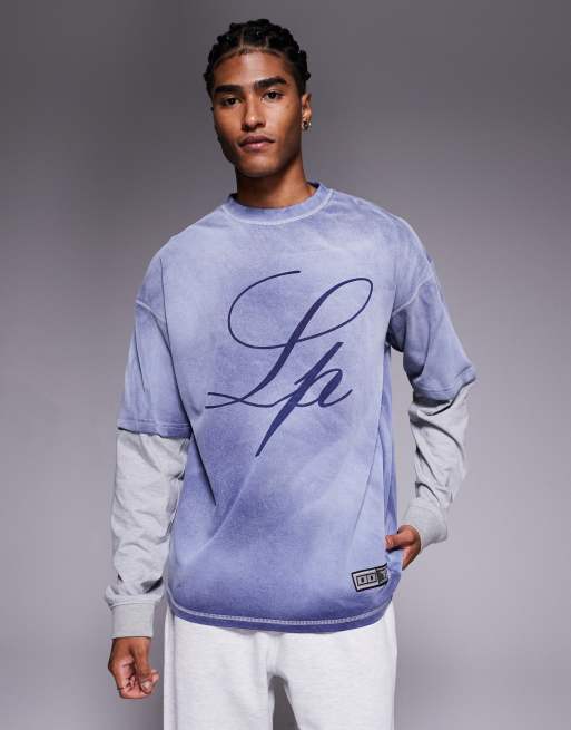 Liquor N Poker 270gsm melange long sleeve t-shirt with distorted logo in navy