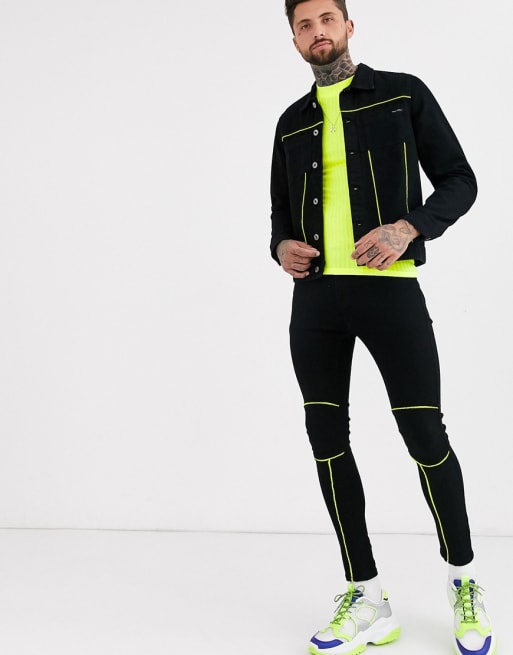 Liquor N Poker denim co-ord with neon piping in black