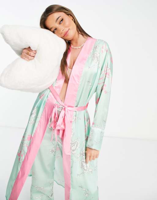 Liquorish satin blossom robe in mint and pink