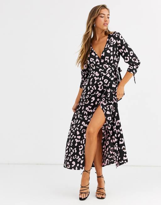 Liquorish wrap front maxi dress in black leopard print