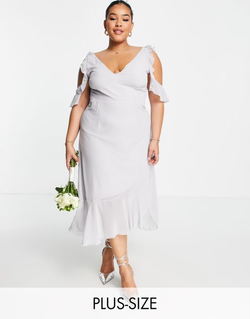 Little Mistress Plus Bridesmaid cold shoulder midi dress in light grey