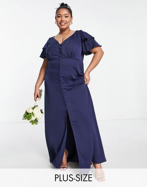 Little Mistress Plus Bridesmaid satin maxi dress with flutter sleeves in navy