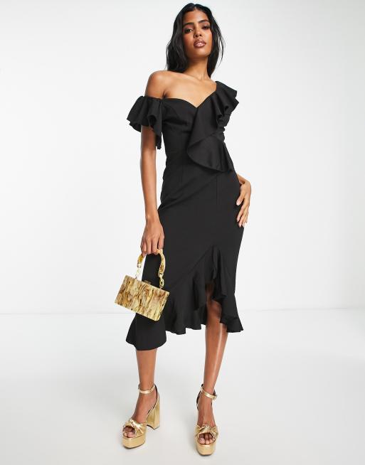 Little Mistress one shoulder midi dress in black
