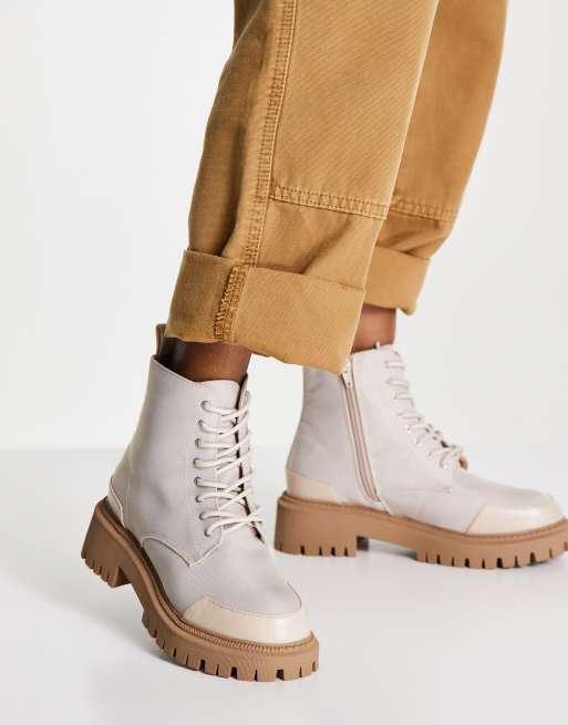 London Rebel chunky lace up ankle boots with toe cap in beige
