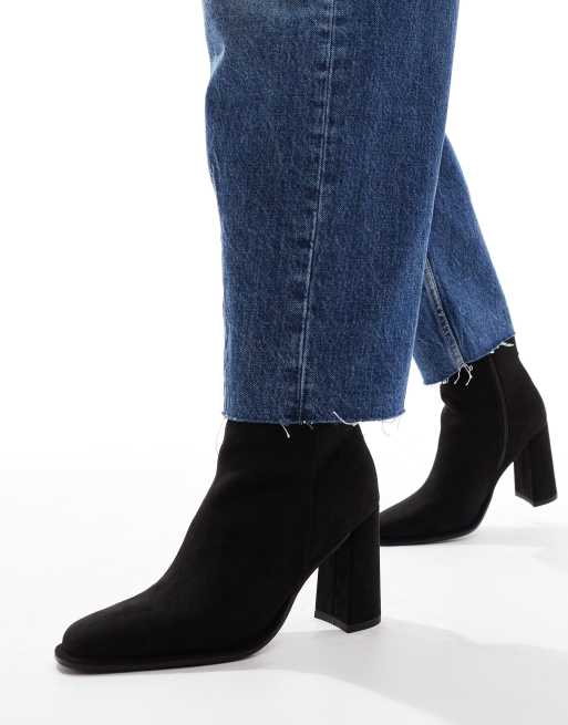 London Rebel Maddie block heel ankle boot in black micro