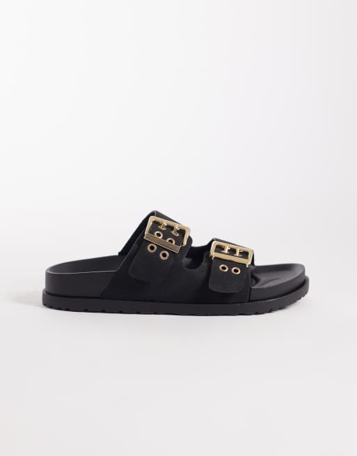 London Rebel Morgan double buckle flat sandals in black