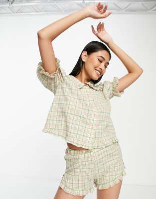 Lost Ink frilly collar button front top and short set in pink and green check print