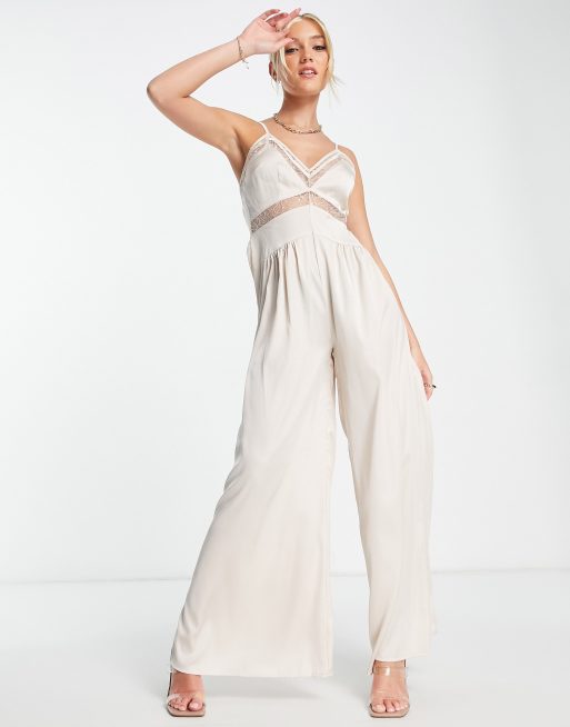 Lost Ink wide leg satin lace insert jumpsuit in champagne