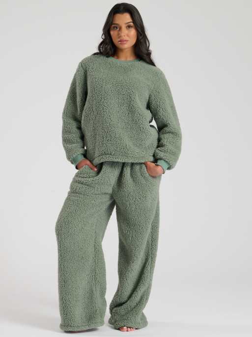 Loungeable Borg jumper & wide leg lounge set in green