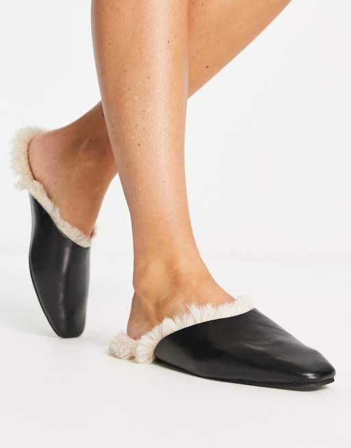 Loungeable faux fur lined PU mule slipper in black and cream