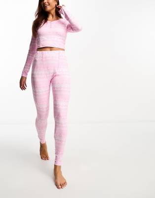 Loungeable jersey button up long sleeve top and legging in pink fairisle print