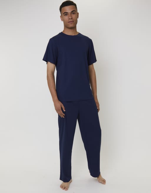 Loungeable Men's pyjamas short sleeve and trouser waffle pjyama set in navy