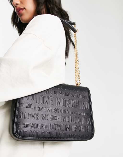 Love Moschino embossed logo flap top shoulder bag in black