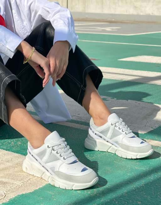 Love Moschino logo and panel trainers in white and silver