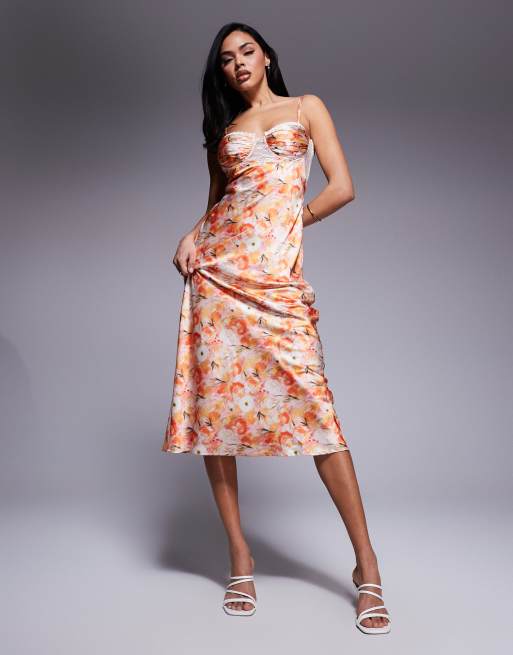 Love Triangle satin maxi dress with lace trim cups in coral print