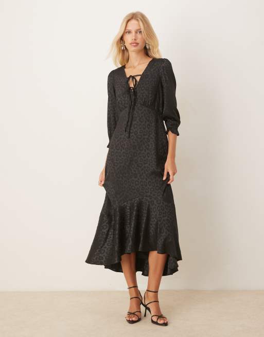 Lovedrobe Animal jacquard tie neck high-low hem dress in black