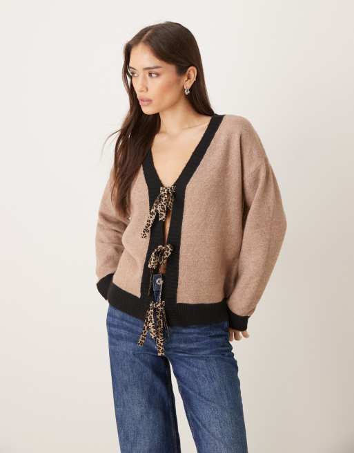 Lovedrobe Contrast edge animal print self tie cardigan in camel