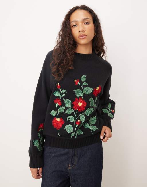 Lovedrobe Floral embroidery raglan sleeve jumper in black