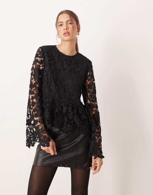 Lovedrobe Floral lace bell sleeve peplum top in black