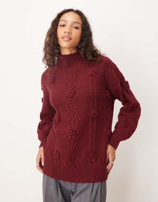 Lovedrobe Floral motif cable knit high neck jumper in burgundy
