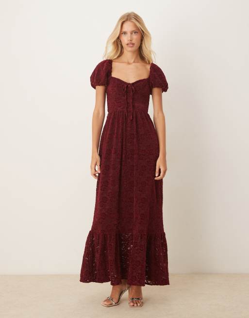 Lovedrobe Floral velvet lace square neck midaxi dress in burgundy