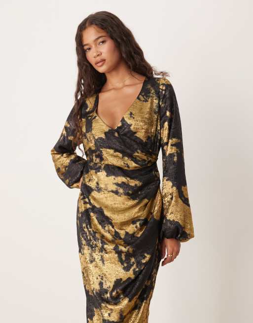 Lovedrobe Long sleeve faux wrap gathered midaxi dress in gold