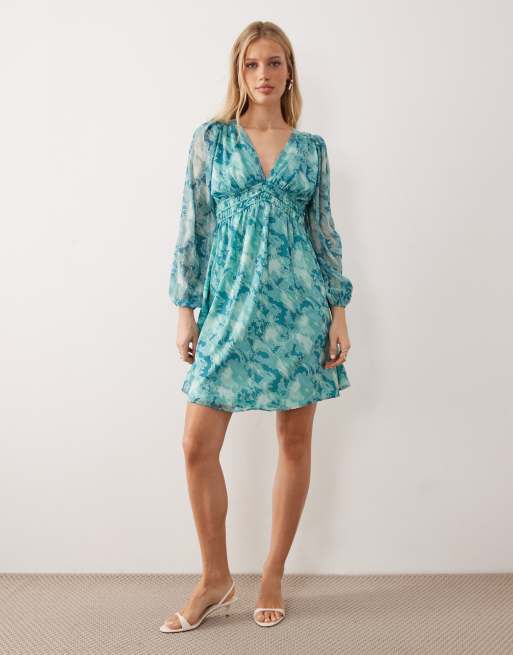Lovedrobe Long sleeve shirred empire waist mini dress in green