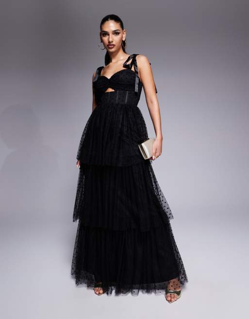 Lulus bow shoulder tiered maxi dress in black