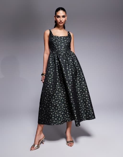 Lulus bustier jacquard midi dress in deep green floral