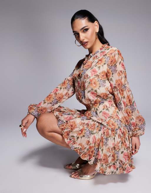 Lulus chiffon frill hem mini dress in taupe floral