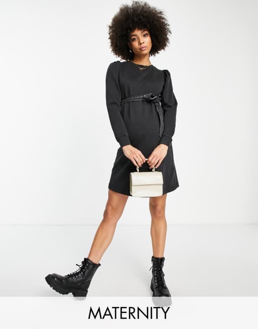Mamalicious Maternity cotton sweater dress with tie waist in washed black - BLACK