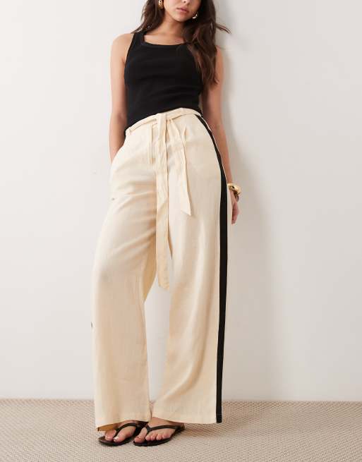 Mango 100% linen tie waist straight trouser with side stripe in light beige