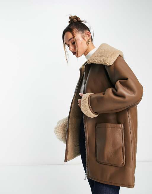 Mango aviator jacket with faux fur lining in brown